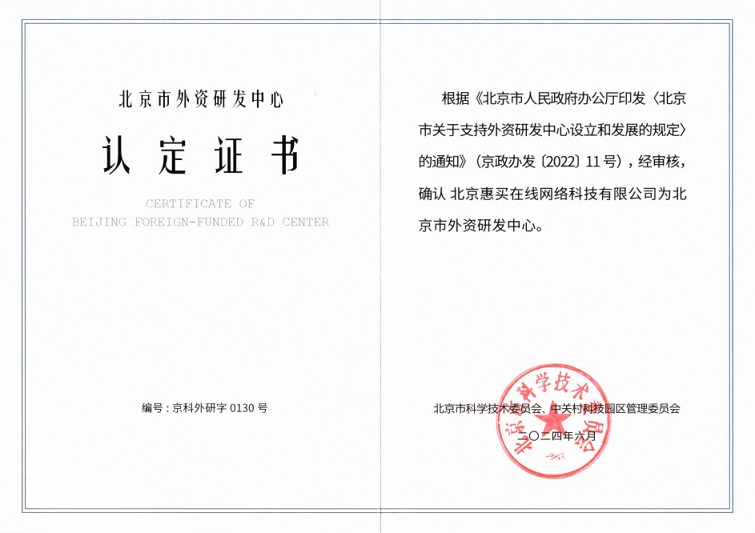 喜报!祝贺惠买荣获“北京市外资研发中心”认定证书