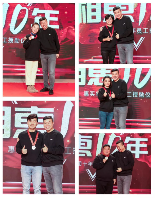 在授勋仪式上,惠买集团董事长杜瑞勇发表致辞:“回想我们这一路走来,确实不容易,非常感谢各位老员工的陪伴和辛苦付出。很多员工的称呼从小张变成了老张,很多人体型发福了,头发变白了……看着大家这一张张熟悉的面孔,非常感慨,也非常感谢。”